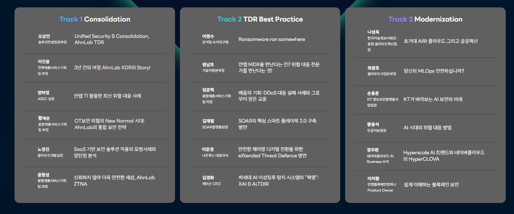 - 트랙 세션(Track Session): △Consolidation(통합) △TDR(Threat Detection & Response) Best Practice(TDR 베스트 프랙티스) △Modernization(현대화) 등 3개 트랙으로 나눠 안랩∙자회사∙고객사 보안 전문가 등이 최신 보안 트렌드와 대응 기술 및 사례 등 인사이트 공유