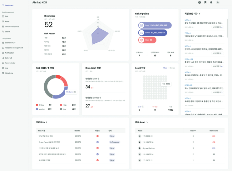- ▲사용자와 자산 중심 리스크 지수화 및 관리 ▲안랩이 축적해온 위협대응 노하우가 녹아있는 ‘시나리오 룰’을 활용한 리스크 분석•대응 ▲위협 인텔리전스(TI) 연동으로 위협이 조직에 미치는 영향도 파악 등 기능으로 보안 담당자의 업무 효율 향상