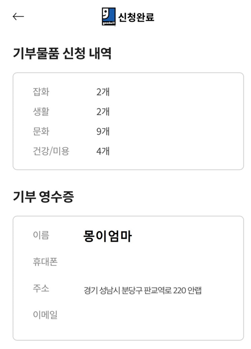 이렇게 쉽고 간단하게 기부영수증까지 발급받았는데요! 내 방에서 잠자고 있던 물건들이 꼭 필요한 사람들에게 저렴한 가격으로 판매되고, 이 수익금이 장애인 근로자의 임금과 일자리 창출에 사용된다고 하니 정말 뿌듯했습니다. . 솔직히 많은 물건들을 회사까지 데리고 오는 것이 조금 번거롭긴 했지만, 그보다 더 큰 나눔의 기쁨을 얻었으니 몽이엄마는 매우 만족(★★★★★)했답니다!