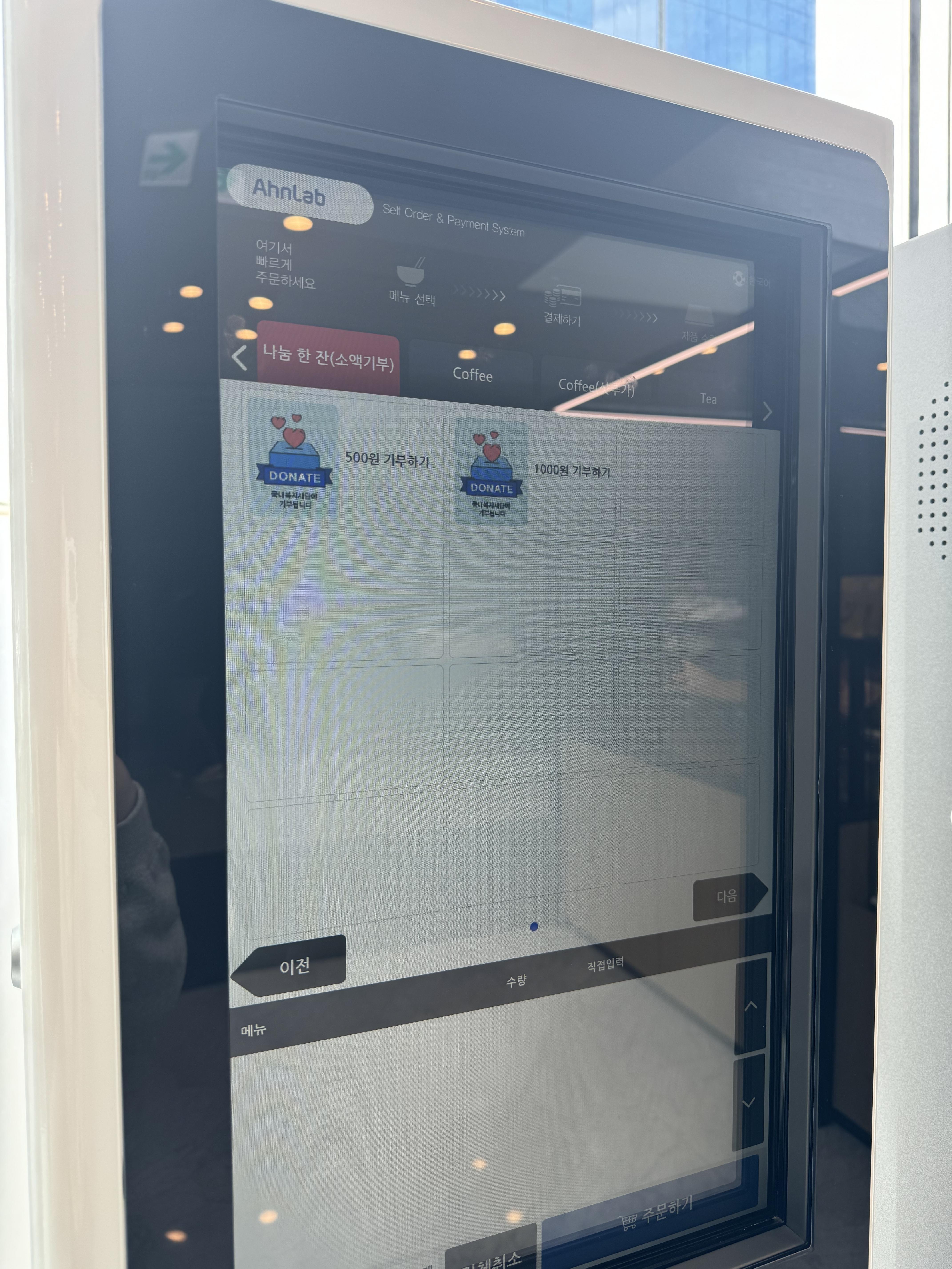 4층 아무무님🥹: 팀원들과 가위바위보 커피 내기를 해서 이겼는데, 장난으로 비싼 메뉴를 시키려고 키오스크 탭을 살펴보다 처음 ‘나눔 한 잔' 메뉴를 알게 되었어요. 남에게 기부를 강요할 수는 없으니, 이후로 혼자 카페에 음료 마시러 왔을 때 기분 좋은 날마다 ‘나눔 한 잔’에 참여하고 있습니다.