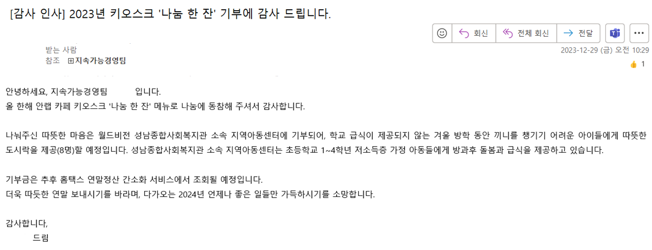 특히 회사에서 기부에 참여하면 연말마다 기부에 참여해 주셔서 감사하다는 메일을 보내주셔서, 메일을 확인할 때 한 번 더 뿌듯함을 느끼고 다음에 또 기부에 참여하고 싶다는 마음이 들곤 해요.
