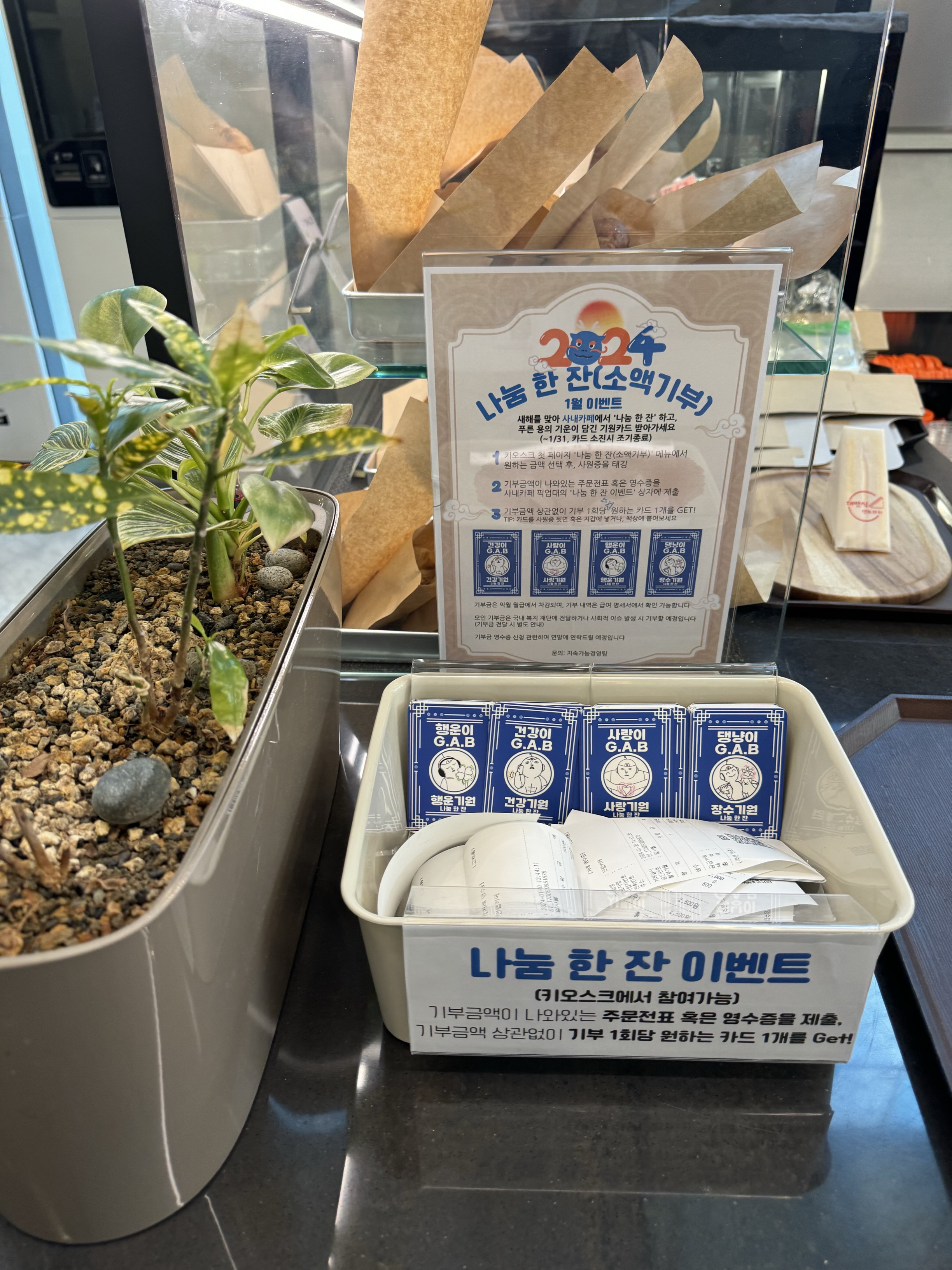 4층 아무무님🥹, DPX개발팀 진세진 주임님 외에도 ‘나눔 한 잔'에 동참해 주신 모든 안랩 직원분들께 감사드립니다. ‘나눔 한 잔’ 메뉴는 2024년에도 계속 운영되고 있는데요, 1, 2월에는 ‘나눔 한 잔’ 하면 푸른 용의 기운이 담긴 기원카드와 갓생 다짐을 담은 갓생카드를 드리는 소소한 이벤트도 했었답니다!