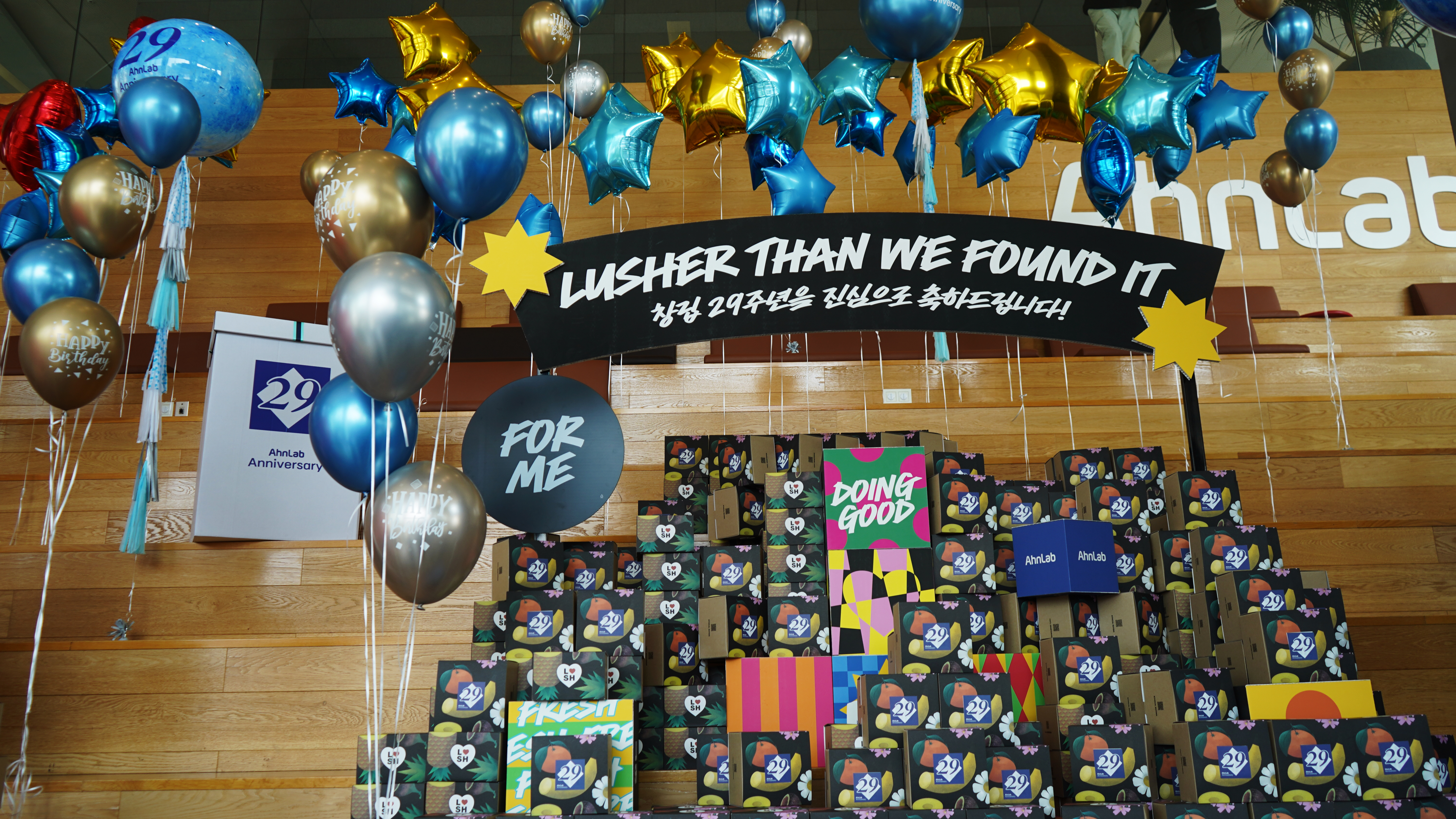 이번 생일에는 스물 아홉 살 생일을 맞기까지 회사의 성장을 함께한 임직원에게 프레쉬 핸드메이드 코스메틱 브랜드 러쉬(LUSH)의 제품이 담긴 선물 상자가 제공되었는데, 샴푸, 입욕제 등이 든 상자에서 단연 눈에 띈 것이 ‘채러티 팟(Charity Pot)’이었습니다. 이 제품의 판매금은 인권·동물보호·환경보전을 위해 노력하는 소규모 비영리 단체에 기부됩니다. 안랩 생일 파티를 위해 회사가 구매한 채러티 팟 700개(8,272,600원)는 ‘청소년기후행동’에 기부된다고 합니다.