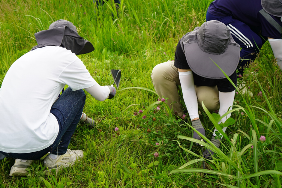 교육을 듣고, 본격적으로 봉사활동을 시작했습니다! 3개의 조로 나누어서 1,2조는 비오톱* 설치, 3조는 생태계교란 식물 (단풍잎돼지풀), 외래 식물(붉은토끼풀), 잡초(살갈퀴) 등을 제거하고(각 리터 마대 4개, 1개, 4개 분량), 비오톱 2개소를 조성했습니다. 😊