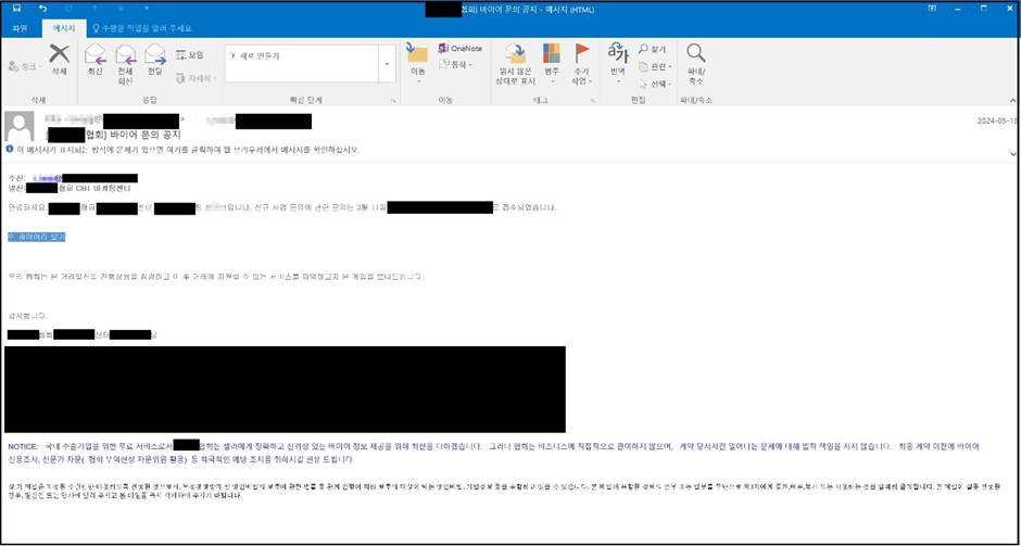 [바이어 문의 공지로 위장한 피싱 메일]