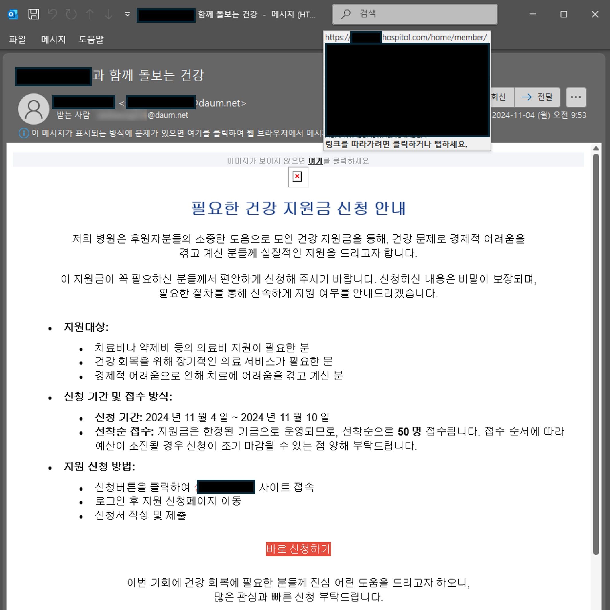 [대형병원 건강 지원금 신청 사칭 사례]
