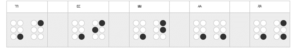 위 표는 기본적인 자음 점자표인데요, 자음 점자는 ‘두 줄 이하’만 사용하도록 규정되어있습니다. 각 자음의 초성과 종성은 다르지만, 종성의 모양을 뒤집거나, 초성을 한 칸 내려 적는 방식으로 되어 있습니다. 초성 ‘ㅇ’은 점자를 생략하고 모음만 사용합니다. ✍