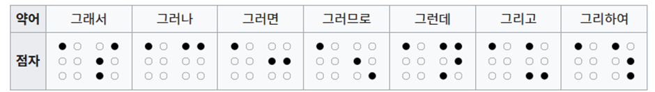 ‘그래서’, ‘그러나’, ‘그러면’ 등과 같은 통상적으로 자주 쓰이는 글자나 단어에는 별도의 기호로 표현됩니다.