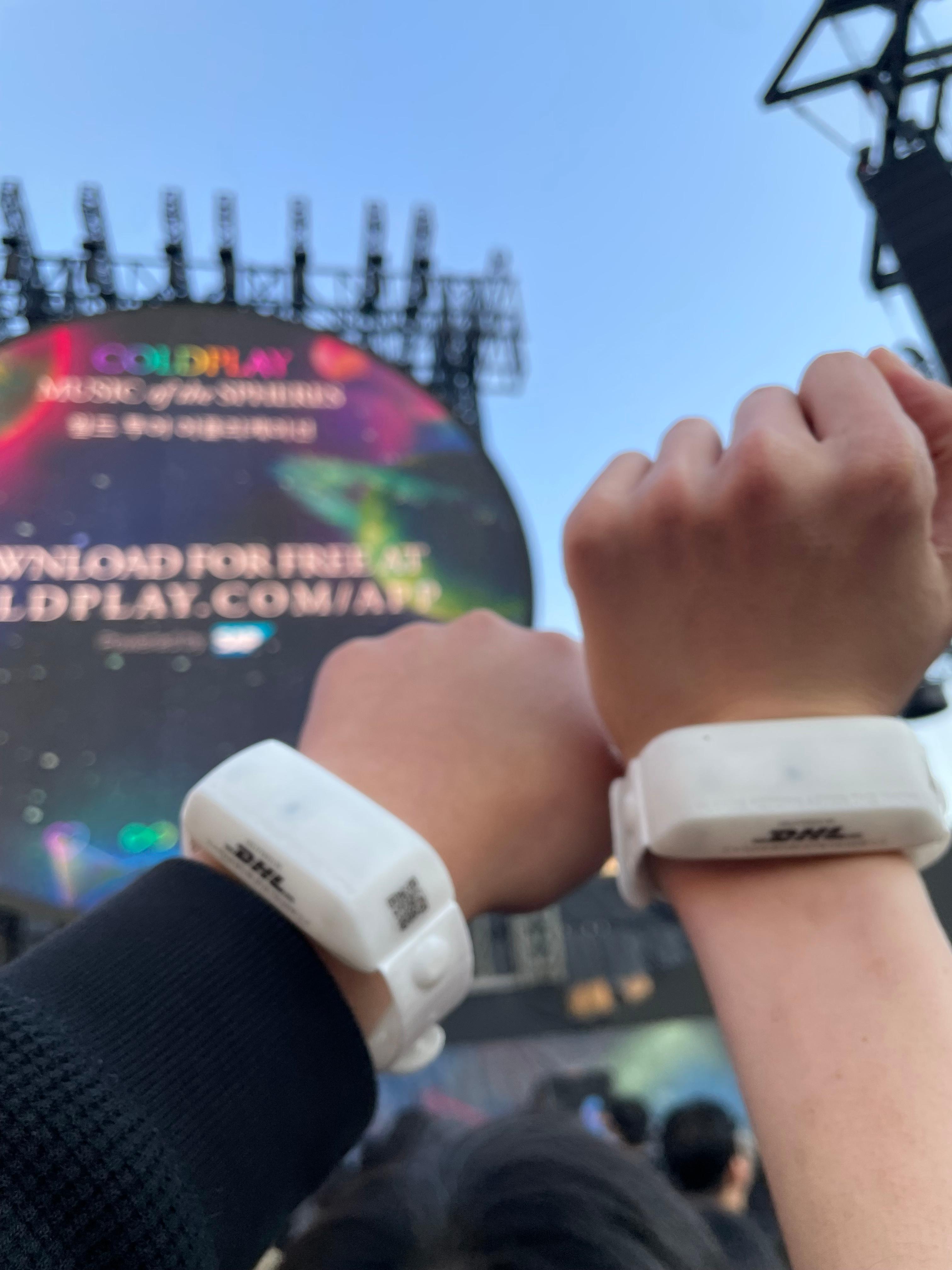 기나긴 대기 줄을 뚫고 입장하면서 자일로밴드(Xyloband)를 받았습니다. 이 손목밴드는 콘서트 중 수만 명의 손목에서 빛나며 장관을 연출했습니다.