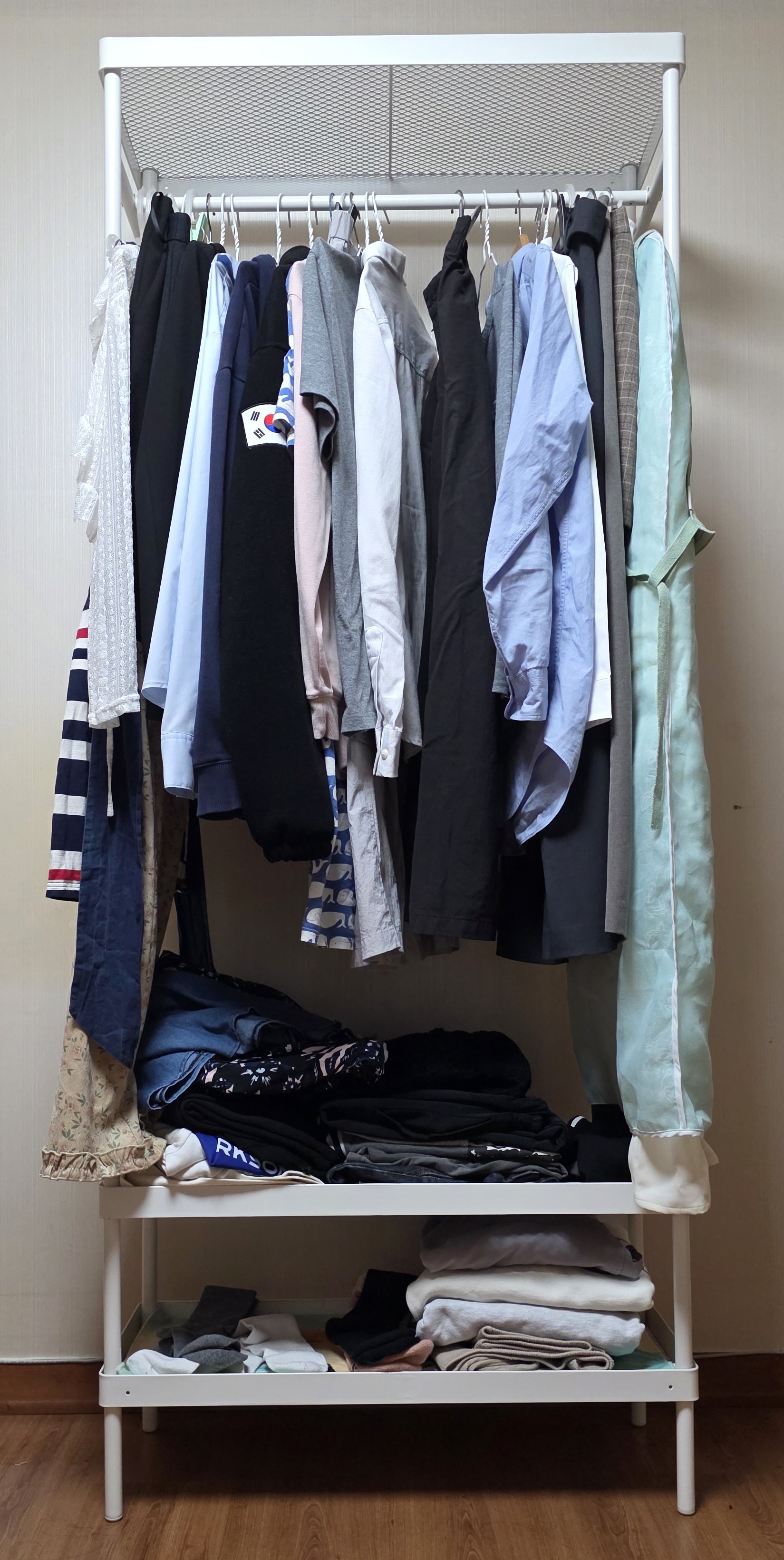 겨울 점퍼 등은 따로 보관하고, 추운 날 입은 맨투맨 등은 옷장 아래 칸에 개어두었어요. 가벼운 봄여름 옷은 옷걸이나 옷장 위 칸에 두어 바로 꺼낼 수 있게 정리했답니다. 이러면 필요한 옷을 바로 찾지 못해 불필요한 옷을 사게 되는 일은 없을 거예요.