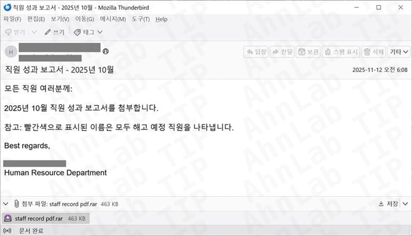 안랩이 공개한 사례에서 공격자는 기업 인사팀을 사칭해 ‘직원 성과 보고서’라는 제목의 메일을 발송했다(보충자료 참조).