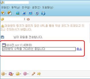 이 악성코드는 네이트온으로 대화 중 ‘내사진.scr’ 등의 파일명으로 첨부됩니다. 이 파일을 다운로드하면 이후 특정 웹페이지에 접속해 11개의 악성코드를 추가로 내려받습니다.