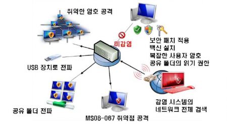 이 악성코드의 피해를 막으려면 MS사가 제공하는 최신 윈도 보안 패치 업데이트를 하고 네트워크 공유 폴더는 읽기 권한만 설정하는 한편 윈도 사용자 계정 암호를 복잡하게 설정해야 합니다.
