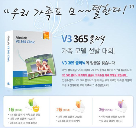 1차 서류 심사, 2차 면접을 거쳐 최종 선발된 15가족은 푸짐한 경품을 받게 되며, 이 중 1등 가족은 ‘V3 365 클리닉’ 모델로서 제품 패키지 및 웹사이트 등에 등장할 예정입니다.