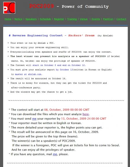 글로벌 통합보안 기업 안철수연구소(대표 김홍선 www.ahnlab.com)는 정보보안 분야의 다양한 분석 기술력을 평가하는 리버스 엔지니어링(보충자료참고) 국제 콘테스트인 '해커스 드림 (Hackers’ Dream) 2009'를 개최한다고 밝혔다.