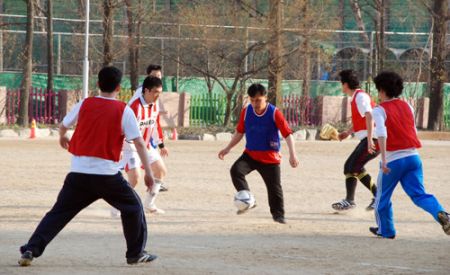 안철수연구소도 신명나고 아름다운 일터 만들기의 일환으로 "V3배 안랩 A리그 축구대회"를 7일부터 시작했습니다. 500여 명의 안랩인들이 근무를 하지만, 긴급대응 조직 및 고객지원 부서 등 팀원을 꾸리기 쉽지 않아 2개의 본부를 한팀으로 묶어 총 4개의 팀을 만들었습니다. 경기방식은 매주 화요일과 목요일 한경기씩 예선 풀리그를 통해 1,2위 팀을 결정하고, 이들이 다시 최종 결승전을 치러 우승팀을 가리게 됩니다. 그리고 체력적으로 힘든점을 감안하여, 연수생들도 쿼터당 2명씩 뛸 수 있도록 했습니다.