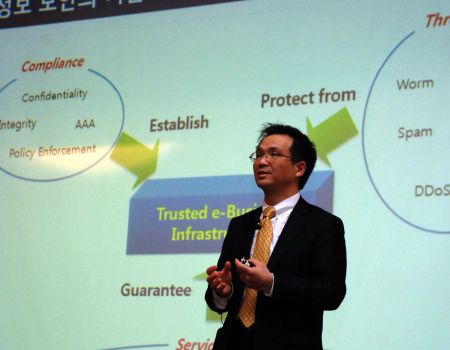 이번 세미나에서 김홍선 대표는 통합보안 관제 서비스 및 미래 지향 통합보안 전략으로 클라우드 컴퓨팅 보안 서비스 전략(ACCESS)을 발표할 예정이며, 보안사업본부장인 조동수 전무는 최근 보안 이슈 및 통합 보안 대응 전략에 대해 발표할 예정입니다. 이어 전성학 소프트웨어연구실장 등이 나서 엔드포인트 통합보안의 새 패러다임, 웹 보안 이슈 및 보안 서비스, 최근 DDoS 공격 유형 및 대응 방안, 차세대 네트워크 보안 기술 로드맵, 보안 대응 사례 등을 발표할 예정입니다.
