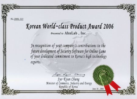 또한 온라인 게임 보안 솔루션인 ‘핵쉴드’도 2006년 7월 '차세대세계일류상품'에 선정된 후 현재까지 자격을 유지하고 있습니다.