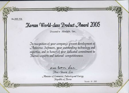 V3 제품군은 2001년 '차세대세계일류상품'으로 선정되고, 2005년 '현재세계일류상품'으로 승격되어 현재까지 9년째 줄곧 지위를 유지하고 있습니다.