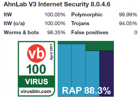 V3 IS 8.0은 4월 국제 안티바이러스 평가 기관인 '바이러스 불러틴(www.virusbtn.com)'에서 진행한 인증 테스트에서 'VB 100% 어워드'를 획득하고, 또한 이에 앞서 2월에는 영국의 바이러스 연구기관인 '웨스트코스트랩 (www.westcoastlabs.com)'이 주관하는 체크마크를 획득했는데요~.