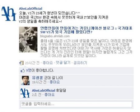 페이스북에도, 안철수연구소 팬페이지를 만들어 안철수연구소를 좋아하는 사람들과 더 가까이 만나게 됩니다.