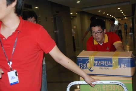 이날 야외에서 수령하기로 하였으나 갑자기 비가 내려 본의아니게 온 건물에 치킨 냄새를 폴폴 풍기게 되었습니다. 500여 명의 전직원들에게 나누어 주기 위해 팀별로 치킨을 나누었는데요, 20명, 40명씩 인원이 많은 팀은 몇 박스나 짊어지고 가기도 했습니다.