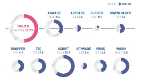 2011년 8월의 감염보고건수 중 악성코드를 유형별로 살펴보면, 트로이목마(TROJAN)류가 36.2%로 가장 많은 비율을 차지하였으며, 스크립트(SCRIPT)가 25.9%, 웜(WORM)이 10%로 각각 그 뒤를 잇고 있습니다. [그림 1]은 8월 한 달 동안 안철수연구소가 집계한 악성코드의 유형별 감염 비율을 분석한 결과입니다.