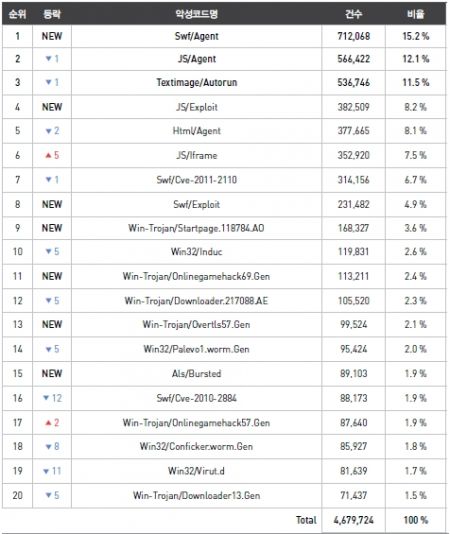 [표 1]에 나타난 바와 같이 2011년 8월의 악성코드 감염 보고는 Swf/Agent가 1위를 차지하였으며 JS/Agent과 Textimage/Autorun이 각각 2위와 3위를 차지해 여전히 높은 수치를 보였습니다. 신규로 Top 20에 진입한 악성코드는 총 7건입니다.
