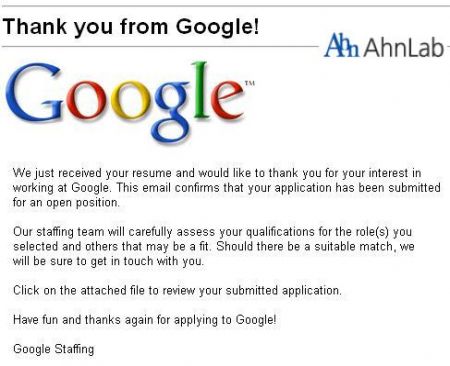 지난달 발견된 프로라코(Win32/Prolaco.worm) 변종은 메일 제목이 ‘Thank you from Google!’이며 본문은 ‘구글에 입사 지원해주어 고맙다. 첨부된 서류를 점검하라’는 내용입니다. 첨부 파일 CV-20100120-112.zip의 압축 파일을 풀면 document.pdf(공백).exe 파일이 생성됩니다. 이후 ‘You have received A Hallmark E-Card!’라는 제목의 메일을 대량 발송하는데, 이 메일의 본문은 ‘친구로부터 축하 카드를 받았으며 첨부 파일을 확인하라’는 내용이며 Postcard.zip파일이 첨부돼 있습니다.