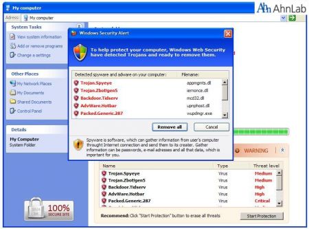 김연아 선수 동영상으로 위장한 것은 2월 24일 동계 올림픽 금메달을 획득한 직후 발견됐습니다. 구글 검색 시 상위에 나온 것 중 하나를 클릭하면 특정 웹사이트로 이동하며 ‘컴퓨터가 악성코드에 취약합니다. 시스템을 검사하려면 OK 버튼을 누르라’라는 창이 뜹니다. 여기서 ‘확인’을 클릭하면 가짜백신인 Windows Security Alert가 악성코드 검사 결과를 보여줍니다.