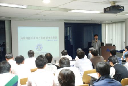 이날 세미나나 장소였던 'A자형 인재'(대회의실)에는 앉지 못하고 서서 강연을 듣는 사람들도 많아 이번 세미나에 대한 안랩인들의 높은 관심도를 알 수 있었습니다. 또 세미나에서는 해커추적을 기술에 대한 구체적인 질문과 답변이 오고 갔고 이를 통해서 종전에 알려지지 않았던 수사 기술 및 기법에 대해서 알 수 있게 되었습니다.