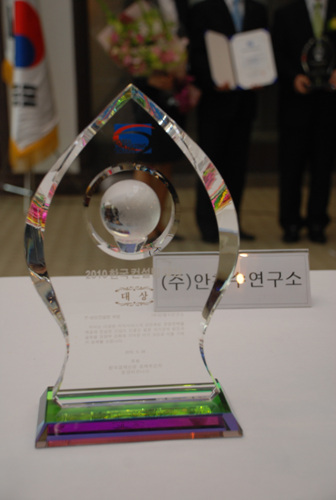 안철수연구소 포함 9개분문에서 10개의 기업이 올해 컨설팅 우수기업으로 선정됐습니다. 한경비즈니스가 주최하고 국민대경영연구소가 후원, 한국지식정보진흥원이 주관한 '2010한국컨설팅대상' 에서 한국경제매거진 양승득 대표와 한국방송통신연구원 조강환 회장이 시상자로 나섰습니다.