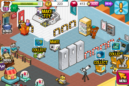 페이스북 연계기능을 바탕으로 친구들과의 협력요소도 강화했다. 먼저 친구의 공장을 방문해 풍선을 터뜨려 장난감을 만들기 위해 가장 중요한 요소인 ‘재료’를 획득할 수 있다. 친구의 매장에 있는 ‘럭키머신’을 통해 게임코인이나 꾸미기 아이템을 획득 할 수 있을 뿐만 아니라, 친구에게 내 장난감을 특별 주문 할 수도 있다. 주문수락 시 재료소진 없이 장난감제작이 진행되며, 주문자와 주문을 수락한 친구 모두에게 판매수익만큼의 코인이 지급된다.
