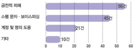 피해 경험이 있다고 답한 응답자 중 14.9%는 구체적인 피해를 입었다고 전했습니다. 구체적인 피해로는 금전적 피해가 56건으로 가장 많았고, 스팸 문자나 보이스피싱이 45건, 계정 및 명의 도용 21건, 기타 10건으로 나타났습니다. 정신적인 피해와 개인정보 유출에 대한 분노를 표출하는 응답자도 있었습니다.