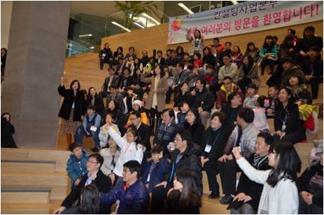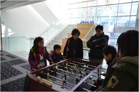 먼저 가족들이 안랩 계단에 모여서 다들 흥미롭게 회사 소개를 듣는 모습입니다.