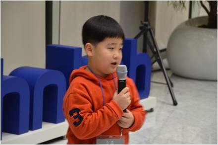 이 귀여운 꼬마는 하병수 차장의 아들입니다. 수줍게 두 손으로 마이크를 잡고 노래를 부르는 모습입니다.