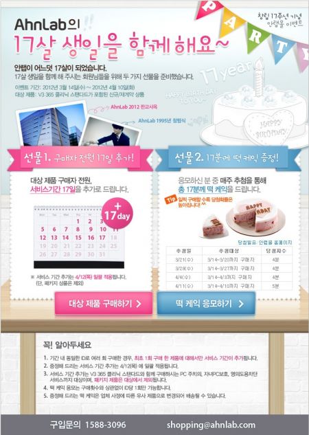 따라서 안철수연구소에서는 17번째 생일을 여러분들과 함께 하기위해 자사에서 운영하는 '믿음을 드리는 안전한 쇼핑몰' 안랩몰(http://shop.ahnlab.com)에서 축하 이벤트를 진행합니다!