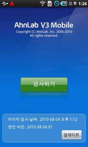삼성전자, LG전자, 팬택 안드로이드폰에 탑재된 V3 모바일(안드로이드) 사용자는 메인 화면에 '업데이트' 버튼으로 엔진 업데이트를 하고, '검사하기'를 눌러 검사하면 됩니다.
