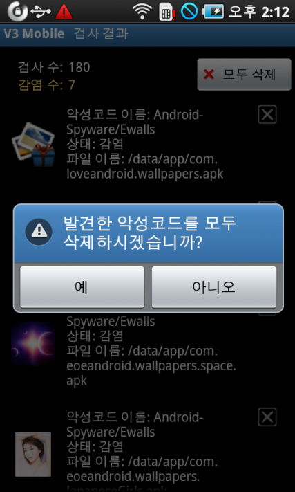 이번에 발견된 앱은 일종의 스파이웨어로서 정상적인 월페이퍼 앱 내부에서 사용자정보를 수집하고, 네트워크로 전달하는 기능이 들어 있습니다. V3 모바일 제품군은 이를 Android-Spyware/Ewalls라고 진단합니다.