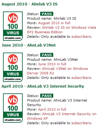 이번 ‘VB 100% 어워드’는 윈도우즈 비스타 SP2 비즈니스 에디션 운영체제에서 테스트했으며, 이번 획득으로 'V3 IS 8.0'는 작년 8월 윈도우 비스타 서비스팩2 비즈니스 에디션 환경에서 인증 받은 이후 연속 3회 인증을 획득했습니다. 또한, 안철수연구소는 올해 2010년에 참가한 3번의 모든 'VB 100' 국제인증 테스트에서 모두 통과하기도 했습니다.