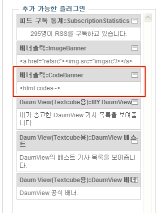 3)사이드바 위젯 탭의 왼쪽 하단 추가가능한 플러그인에서 배너출력::CodeBanner를 오른쪽 사이드 바로 드래그앤 드롭합니다.