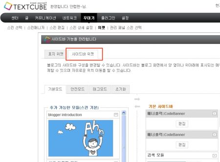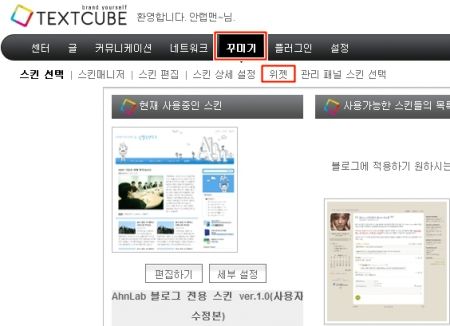2)텍스트큐브 블로그에 로그인 하신 후 [꾸미기]-[위젯]으로 들어갑니다.
