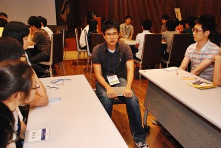 이윽고 많은 친구들이 기다리던 ‘안철수 박사님과의 대화‘ 시간이 찾아왔다. 안철수박사님에 대한 뜨거운 관심 때문에 조금은 어수선한 분위기일 것이라고 예상했었는데, 막상 박사님이 나오시자 행사장이 적막으로 가득 찼다. 아마, 박사님의 한마디도 놓치지 않으려는 학생들의 마음 때문이었을 것이다. 참가 학생들이 궁금해하는 여러 가지 질문들이 오고가면서 TV프로그램에서 보아온 모습과는 또 다른 친근한 안철수 박사님의 모습을 볼 수 있어서 정말 좋았다.