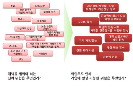 이와 관련해 김홍선 대표가 특히 강조한 것은 위협(Threat)과 위험(Risk)의 구분이었습니다. 스마트폰의 구조 상 PC단위에서 일어날 수 있는 모든 상황이 발생할 수 있음은 사실이나 사람들은 스마트폰과 보안을 이야기 할 때 예단적 속성의 ‘위협’과 실제 발생할 수 있는 ‘위험(리스크)’을 혼용하고 있다는 것입니다. 김대표는 해킹이 가능하다는 사실 자체보다는 기업 및 고객의 정보가 유출되거나 DDoS 공격을 받을 가능성이 있는지의 여부, 즉 ‘리스크의 측면’에서 접근해야 하며 사용자에게 “스마트폰은 해킹 당할 수도 있다더라.”는 막연한 위험성을 갖게 하기보다는 실제 발생할 수 있는 ‘위협’을 올바르게 인지할 수 있게 해야 함을 강조했습니다.