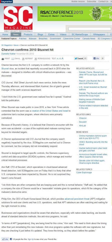 기사 원문 : http://www.scmagazine.com/chevron-confirms-2010-stuxnet-hit/article/267769/