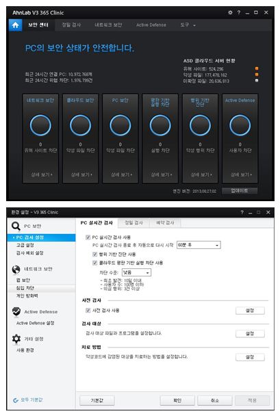 [그림 5] V3 365 클리닉 고급 화면(위), V3 365 클리닉 환경 설정(아래)