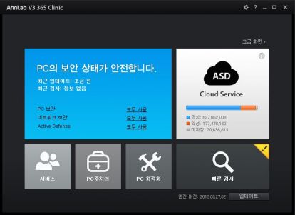 V3 365 클리닉의 메인 화면은 [그림 1]과 같이 PC 보안 상태, ASD Cloud Service, 서비스, PC 주치의, PC 최적화, 빠른 검사 등으로 구성돼 있다.