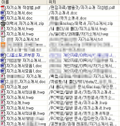 아래 그림은 P2P 프로그램에서 "이력서"라고 검색했을 때 나오는 자료들이 이러한 실수로 유출되는 개인 정보 자료이다. 이력서나 자기소개서는 주민 등록 번호, 주소, 학력 등 그 사람의 모든 개인 정보를 요약해 놓은 문서이다. 이러한 자료가 다른 사람의 손에 넘어간다면 자칫 악의적인 목적으로 사용될 수 있다.