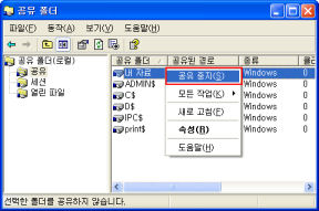 원치 않는 공유 폴더가 있다면 마우스 오른쪽을 눌러 공유 중지를 선택하여 공유를 해제한다. 꼭 공유를 해야 한다면 속성을 눌러 접근할 수 있는 사용자를 제한적으로 설정하는 것이 좋다.