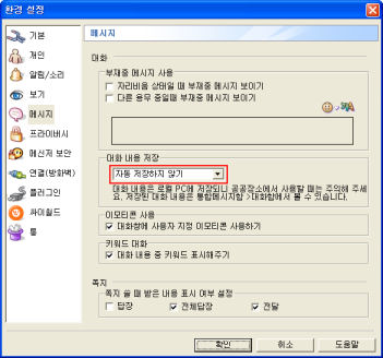 MSN 메신저의 경우 기본적으로 C:\Documents and Settings\로그인 계정\My Documents\받은 파일\MSN 아이디\대화 내용에 저장된다. 해당 폴더안의 xml 파일을 주기적으로 지워주거나 아래와 같이 옵션->메시지에서 대화 내용을 자동으로 저장을 선택 해제하여 사용하는 것이 좋다.